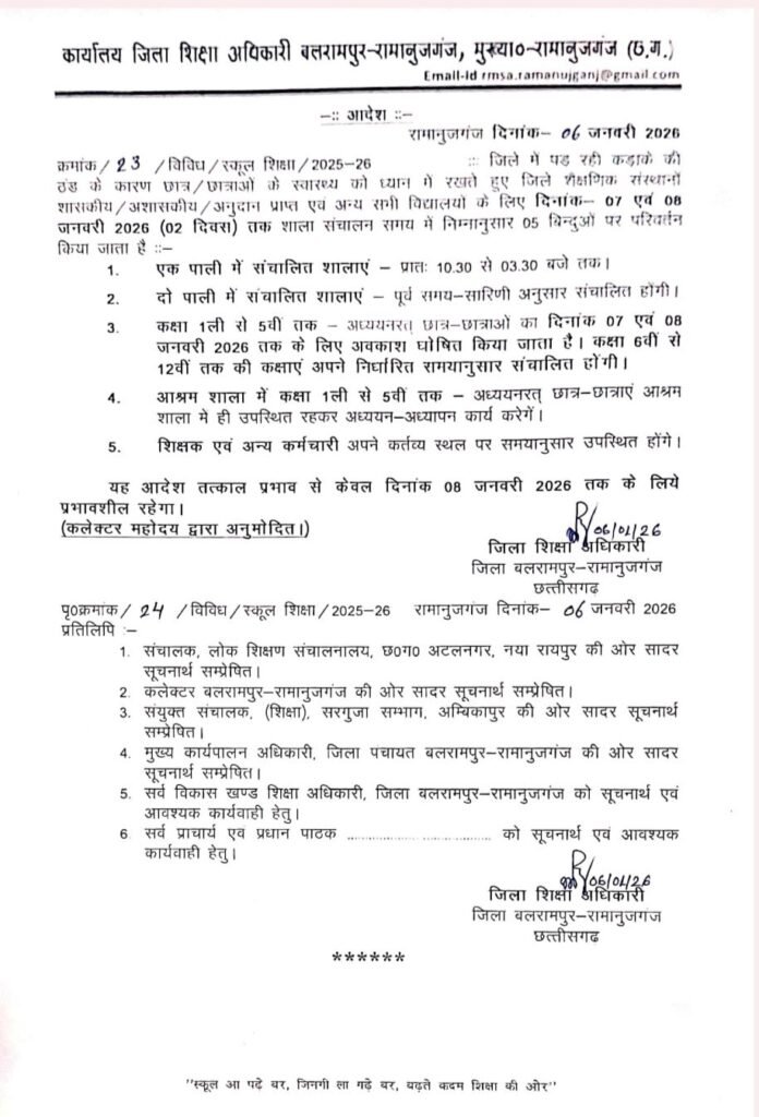 बलरामपुर।जिले में पड़ रही भीषण ठंड को ध्यान में रखते हुए बच्चों के स्वास्थ्य की सुरक्षा के लिए जिला प्रशासन ने अहम निर्णय लिया है। जिला शिक्षा अधिकारी के अनुमोदन से कलेक्टर ने सभी शासकीय एवं अशासकीय विद्यालयों में कक्षा पहली से पांचवीं तक की कक्षाएं 8 जनवरी 2026 तक बंद रखने के आदेश जारी किए हैं।