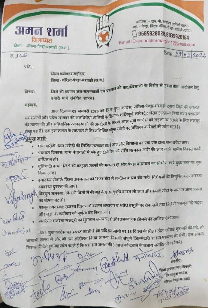 किसानों के हितों को लेकर युवा कांग्रेस ने धान खरीदी की सीमा बढ़ाने की मांग की। उनका कहना है कि वर्तमान लिमिट के कारण किसान मजबूरी में औने-पौने दाम पर धान बेचने को विवश हैं, जो अन्यायपूर्ण है।