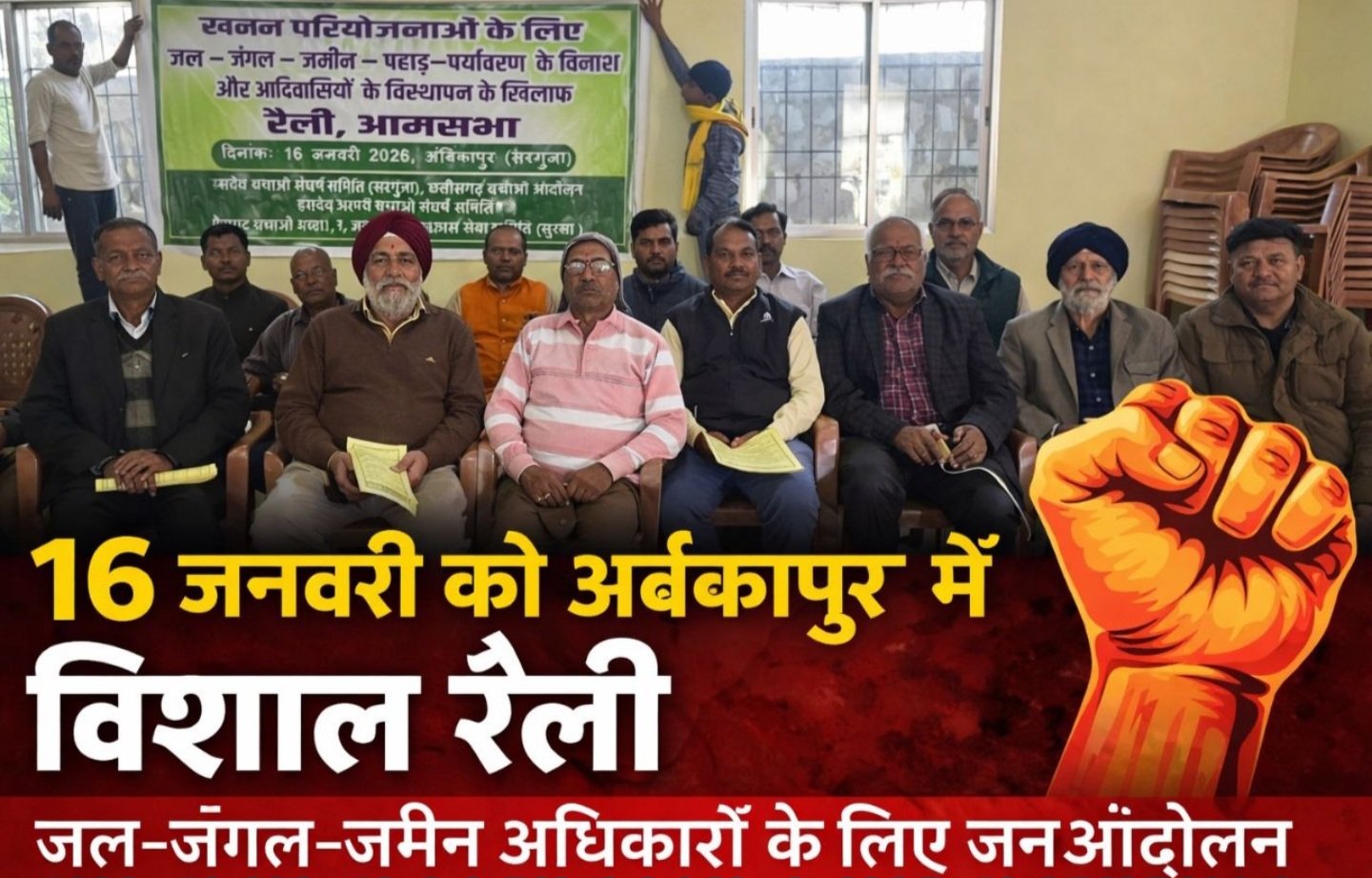 рдЫрддреНрддреАрд╕рдЧрдврд╝ рдореЗрдВ рдЬрд▓, рдЬрдВрдЧрд▓, рдЬрдореАрди рдФрд░ рдЬреИрд╡ рд╡рд┐рд╡рд┐рдзрддрд╛ рдХреЗ рддреЗрдЬрд╝реА рд╕реЗ рд╣реЛ рд░рд╣реЗ рд╡рд┐рдирд╛рд╢ рдХреЗ рдЦрд┐рд▓рд╛рдл рдЬрди рдЖрдВрджреЛрд▓рдиреЛрдВ рдиреЗ рдЖрд░-рдкрд╛рд░ рдХреА рд▓рдбрд╝рд╛рдИ рдХрд╛ рдРрд▓рд╛рди рдХрд░ рджрд┐рдпрд╛ рд╣реИред рдЧреНрд░рд╛рдорд╕рднрд╛ рдХреЗ рд╕рдВрд╡реИрдзрд╛рдирд┐рдХ рдЕрдзрд┐рдХрд╛рд░реЛрдВ рдХреЛ рджрд░рдХрд┐рдирд╛рд░ рдХрд░ рдЦрдирди рдкрд░рд┐рдпреЛрдЬрдирд╛рдУрдВ рдХреЛ рдЖрдЧреЗ рдмрдврд╝рд╛рдП рдЬрд╛рдиреЗ рдФрд░ рдЖрджрд┐рд╡рд╛рд╕реА рд╡рд┐рд╕реНрдерд╛рдкрди рдХреЗ рд╡рд┐рд░реЛрдз рдореЗрдВ 16 рдЬрдирд╡рд░реА 2026 рдХреЛ рд╕реБрдмрд╣ 11 рдмрдЬреЗ, рдмреАрдЯреАрдЖрдИ рдЧреНрд░рд╛рдЙрдВрдб рдЕрдВрдмрд┐рдХрд╛рдкреБрд░ рдореЗрдВ рд╡рд┐рд╢рд╛рд▓ рд░реИрд▓реА рд╡ рдЖрдорд╕рднрд╛ рдЖрдпреЛрдЬрд┐рдд рдХреА рдЬрд╛рдПрдЧреАред рдпрд╣ рдЖрдпреЛрдЬрди рд╣рд╕рджреЗрд╡ рдмрдЪрд╛рдУ рд╕рдВрдШрд░реНрд╖ рд╕рдорд┐рддрд┐ рдХреЗ рд╕рдВрдпреЛрдЬрди рдореЗрдВ рдХрд┐рдпрд╛ рдЬрд╛ рд░рд╣рд╛ рд╣реИред