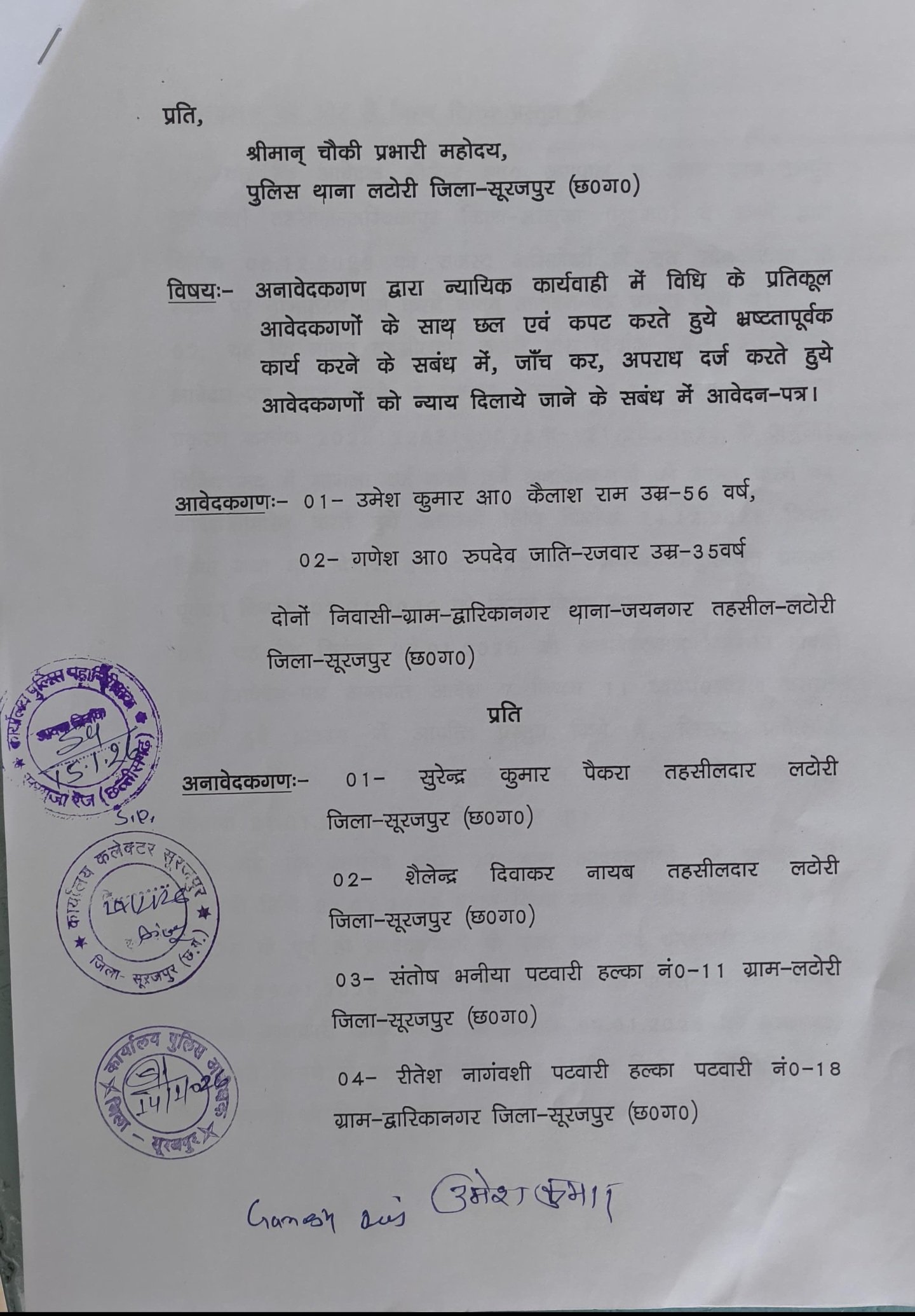 рд╢рд┐рдХрд╛рдпрдд рдореЗрдВ рдпрд╣ рднреА рдЖрд░реЛрдк рд▓рдЧрд╛рдпрд╛ рдЧрдпрд╛ рд╣реИ рдХрд┐ рд▓рдЯреЛрд░реА рдЧреНрд░рд╛рдо рд╕реЗ рдЬреБрдбрд╝реЗ рдорд╛рдорд▓реЛрдВ рдХрд╛ рдЕрдзрд┐рдХрд╛рд░ рддрд╣рд╕реАрд▓рджрд╛рд░ рд╕реБрд░реЗрдВрджреНрд░ рдкреИрдВрдХрд░рд╛ рдХреЗ рдкрд╛рд╕ рд╣реИред