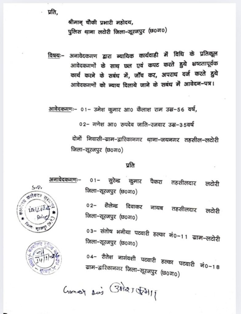 14 рдЬрдирд╡рд░реА 2026 рдХреЛ рдпрд╣ рдорд╛рдорд▓рд╛ рдХрд▓реЗрдХреНрдЯрд░ рд╕реВрд░рдЬрдкреБрд░, рдПрд╕рдкреА рд╕реВрд░рдЬрдкреБрд░ рдФрд░ рдЖрдИрдЬреА рд╕рд░рдЧреБрдЬрд╛ рд░реЗрдВрдЬ рддрдХ рдкрд╣реБрдВрдЪрд╛рдпрд╛ рдЧрдпрд╛ред рдорд╛рдВрдЧ рдХреА рдЧрдИ рд╣реИ рдХрд┐ рддрд╣рд╕реАрд▓ рдиреНрдпрд╛рдпрд╛рд▓рдп рдХреА рдореВрд▓ рдлрд╛рдЗрд▓ рддрддреНрдХрд╛рд▓ рдЬрдмреНрдд рд╣реЛ рджреЛрд╖реА рдЕрдзрд┐рдХрд╛рд░рд┐рдпреЛрдВ рдкрд░ рдПрдлрдЖрдИрдЖрд░ рджрд░реНрдЬ рдХрд░ рдирд┐рд╖реНрдкрдХреНрд╖ рдЬрд╛рдВрдЪ рдХреА рдЬрд╛рдПред