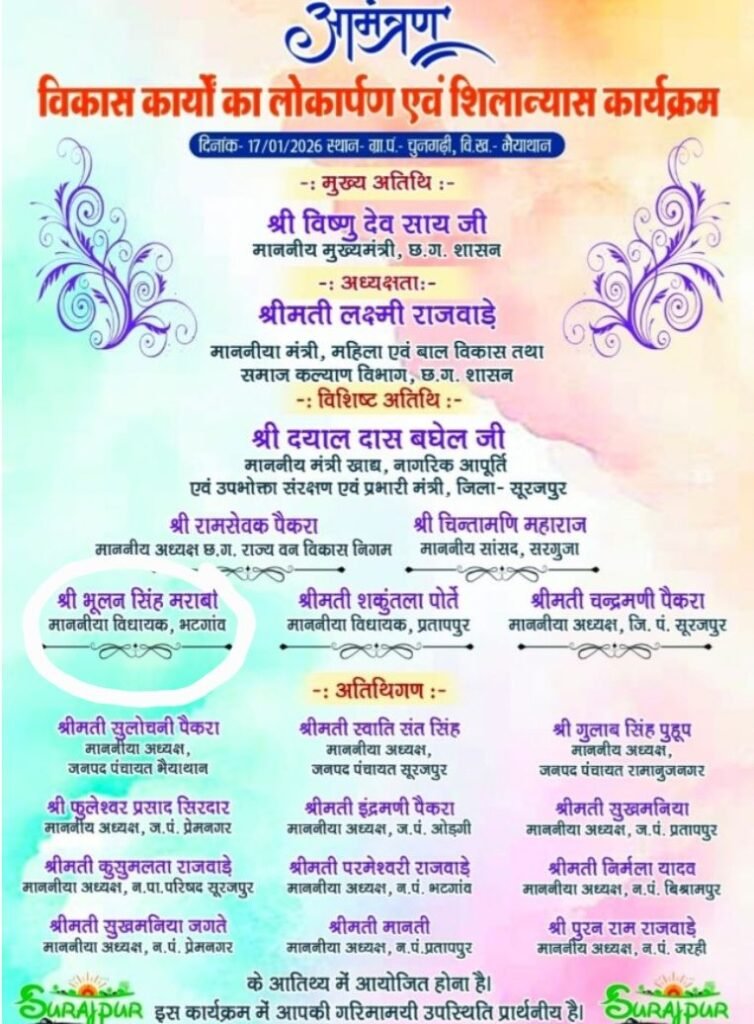 कार्यक्रम को लेकर प्रशासन की ओर से आमंत्रण पत्र छपवाकर वितरित किए गए, लेकिन इन्हीं पत्रों में एक बड़ी और चौंकाने वाली ग़लती सामने आई है। आमंत्रण पत्र में प्रेमनगर विधायक भूलन सिंह मरावी को भटगांव विधानसभा का विधायक दर्शा दिया गया, जिससे राजनीतिक और प्रशासनिक हलकों में हलचल मच गई है।