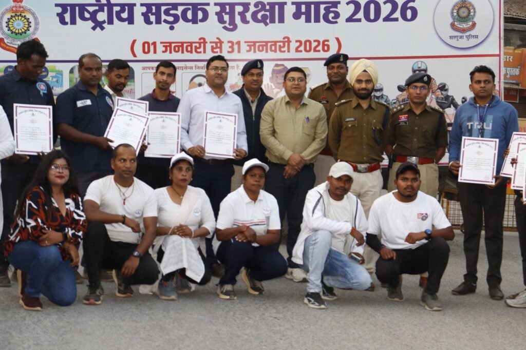 37рд╡реЗрдВ рд░рд╛рд╖реНрдЯреНрд░реАрдп рд╕рдбрд╝рдХ рд╕реБрд░рдХреНрд╖рд╛ рдорд╛рд╣тАУ2026 рдХреЗ рддрд╣рдд рд╕рд░рдЧреБрдЬрд╛ рдкреБрд▓рд┐рд╕ рджреНрд╡рд╛рд░рд╛ рдпрд╛рддрд╛рдпрд╛рдд рдирд┐рдпрдореЛрдВ рдХреЗ рдкреНрд░рддрд┐ рдЬрдирдЬрд╛рдЧрд░реВрдХрддрд╛ рдлреИрд▓рд╛рдиреЗ рдХреЗ рдЙрджреНрджреЗрд╢реНрдп рд╕реЗ рд╡рд┐рднрд┐рдиреНрди рдХрд╛рд░реНрдпрдХреНрд░рдореЛрдВ рдХрд╛ рдЖрдпреЛрдЬрди рдХрд┐рдпрд╛ рдЬрд╛ рд░рд╣рд╛ рд╣реИред рдЗрд╕реА рдХреНрд░рдо рдореЗрдВ рд╕рд╛рд░рдереА рд╕рдореНрдорд╛рди рд╕рдорд╛рд░реЛрд╣ рдХрд╛ рдЖрдпреЛрдЬрди рдХрд░ рд╕рдбрд╝рдХ рд╕реБрд░рдХреНрд╖рд╛ рдХреЗ рдХреНрд╖реЗрддреНрд░ рдореЗрдВ рдЙрддреНрдХреГрд╖реНрдЯ рдХрд╛рд░реНрдп рдХрд░рдиреЗ рд╡рд╛рд▓реЗ рд╡рд╛рд╣рди рдЪрд╛рд▓рдХреЛрдВ рдХреЛ рд╕рдореНрдорд╛рдирд┐рдд рдХрд┐рдпрд╛ рдЧрдпрд╛ред