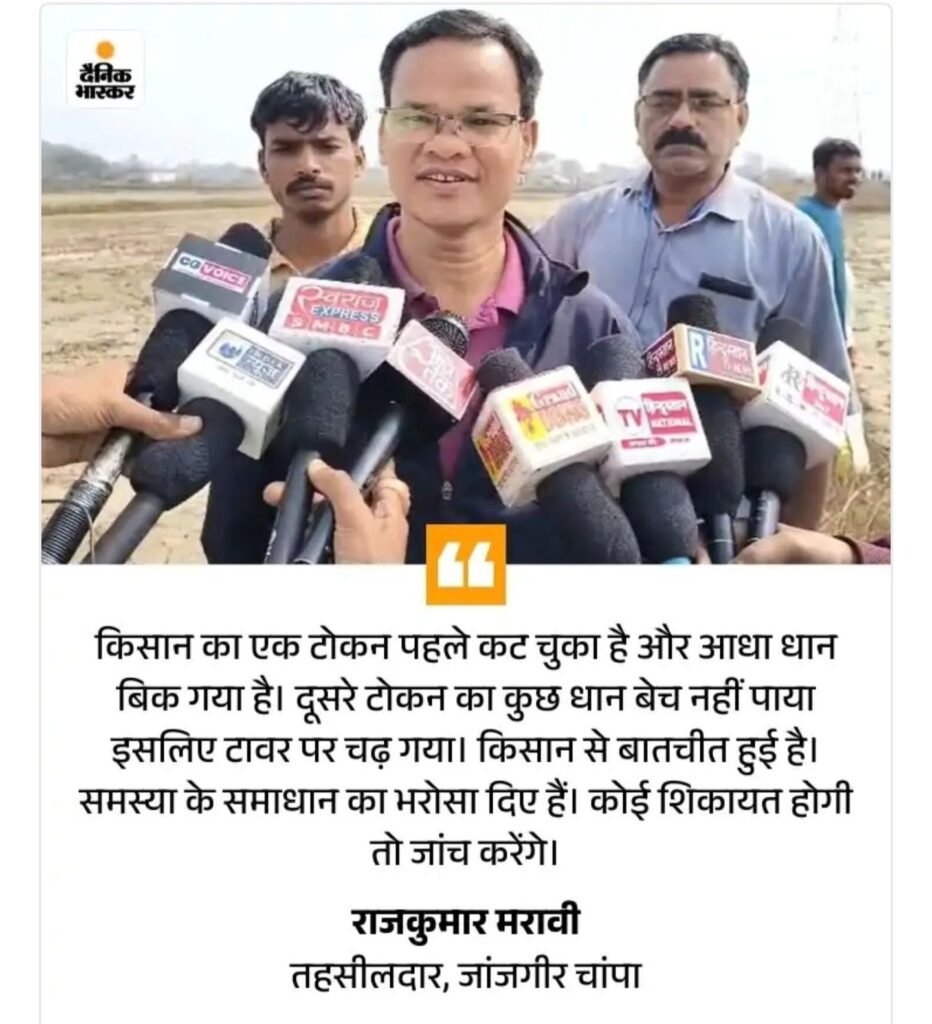 धान बेचने का टोकन न मिलने से परेशान एक किसान ने शनिवार को हद पार कर दी। आक्रोशित किसान गांव के पास लगे 120 फीट ऊँचे हाई-टेंशन बिजली टावर पर चढ़ गया और नीचे उतरने से इनकार कर दिया।