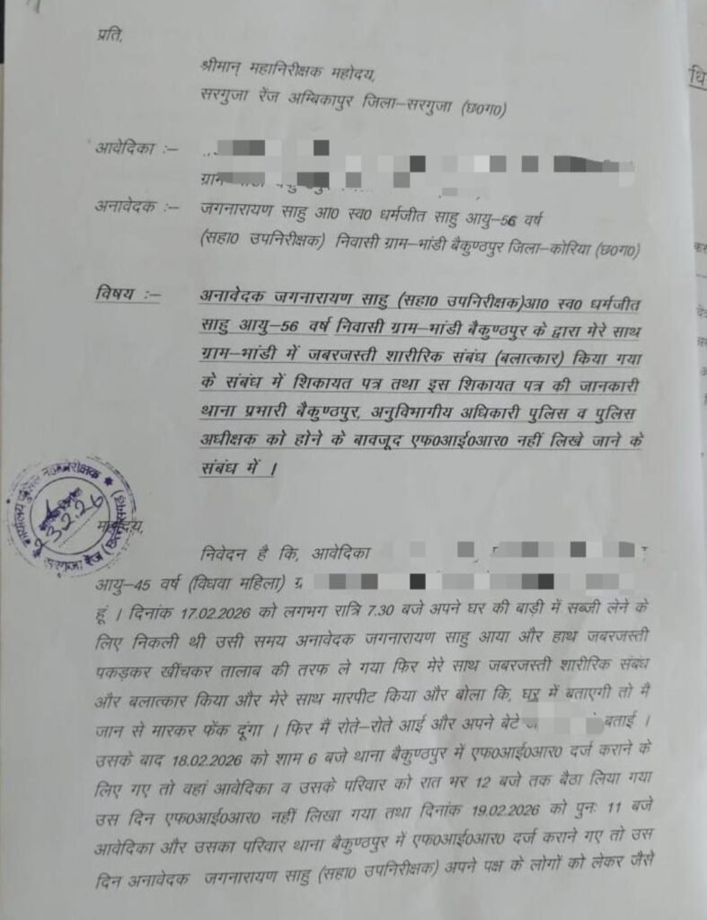बैकुंठपुर (कोरिया)। छत्तीसगढ़ के कोरिया ज़िले से एक बेहद शर्मनाक और विचलित कर देने वाली घटना सामने आई है। बैकुंठपुर में पदस्थ एक सहायक उपनिरीक्षक (ASI) पर अपनी ही विधवा भाभी के साथ दुष्कर्म करने का गंभीर आरोप लगा है। यह घटना न केवल रिश्तों की मर्यादा को तार-तार करती है, बल्कि ख़ाकी वर्दी की गरिमा पर भी बड़ा सवाल खड़ा करती है।