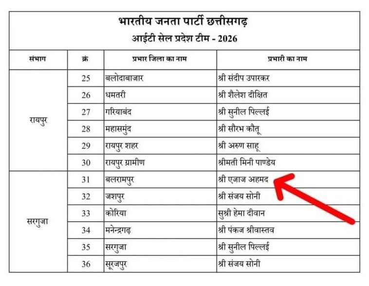 рдкреНрд░рджреЗрд╢ рд╕рдВрдпреЛрдЬрдХ Sunil Pillai рдХреЗ рдиреЗрддреГрддреНрд╡ рдореЗрдВ рдЬрд╛рд░реА рдЗрд╕ рд╕реВрдЪреА рдореЗрдВ рд╕реВрд░рдЬрдкреБрд░ рдЬрд┐рд▓реЗ рдХреЗ рд╕рдХреНрд░рд┐рдп рднрд╛рдЬрдкрд╛ рдХрд╛рд░реНрдпрдХрд░реНрддрд╛ рдПрдЬрд╛рдЬ рдЕрд╣рдордж рдХреЛ рдмрд▓рд░рд╛рдордкреБрд░ рдЬрд╝рд┐рд▓реЗ рдХрд╛ рдЖрдИрдЯреА рд╕реЗрд▓ рдкреНрд░рднрд╛рд░реА рдирд┐рдпреБрдХреНрдд рдХрд┐рдпрд╛ рдЧрдпрд╛ рд╣реИред рдкрд╛рд░реНрдЯреА рд╕рдВрдЧрдарди рджреНрд╡рд╛рд░рд╛ рдЖрдИрдЯреА рд╕реЗрд▓ рдХреЛ рдордЬрд╝рдмреВрдд рдХрд░рдиреЗ рдХреЗ рд▓рд┐рдП рдпрд╣ рдЕрд╣рдо рдЬрд╝рд┐рдореНрдореЗрджрд╛рд░реА рд╕реМрдВрдкреА рдЧрдИ рд╣реИред